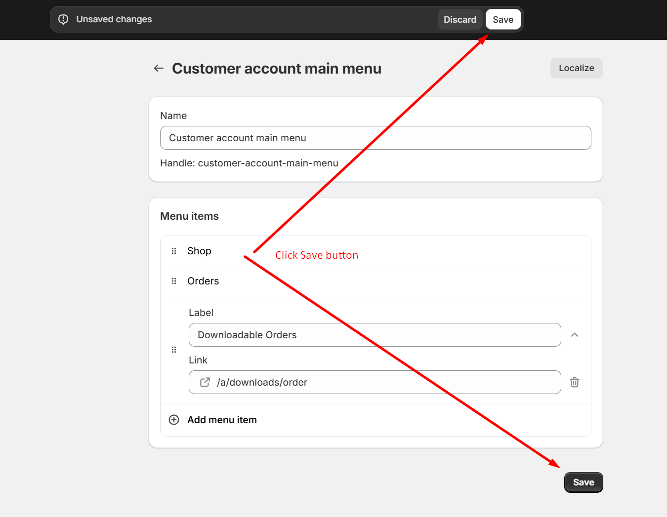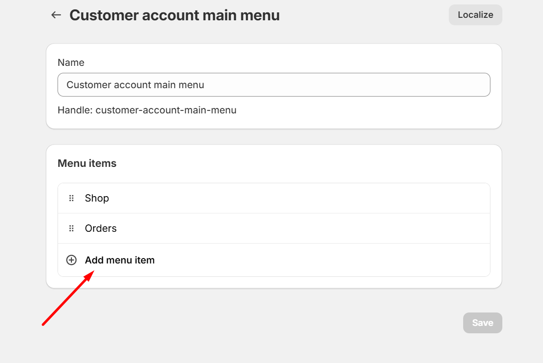 <figure><img src="https://1863660695-files.gitbook.io/~/files/v0/b/gitbook-x-prod.appspot.com/o/spaces%2F6iG7j4lDhziM0FqdCCU8%2Fuploads%2FwJG2tK5Yb9C7S7akl4xU%2Fimage.png?alt=media&#x26;token=e9e4a399-5eb7-4ce9-9710-098caa768d4d" alt=""><figcaption><p>Your shopify admin -> Content -> Menu -> Select <strong>Customer account main menu</strong></p></figcaption></figure>